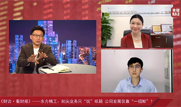 6月2日,東方精工集團(tuán)總裁邱業(yè)致女士參加了央視《財訪·看財報》直播欄目,與央視著名主持人姚振山先生及天風(fēng)證券機(jī)械行業(yè)分析師李魯靖先生共同對話。