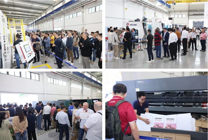 The highlight of this event was the live machine demonstrations by the subsidiaries. At 3 PM, the Dongfang Star I and APSTAR I, and Wonder WD200-60A++ Single pass high-speed printing and slotting inline systems were sequentially started up, reaching a climax of excitement. Excellent printed and accurately formed cardboard boxes quickly appeared in front of everyone. The guests gathered closely around the machines, picking up the printed and assembled boxes, continuously asking the sales staff various questions and exchanging opinions with each other.